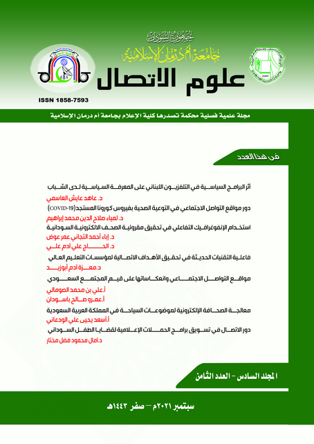 ملخص البحوث: يسعدنا ويشرفنا أن نقدم لكم إصدار هذا العدد الذي يحتوي على العديد من الموضوعات المهمة في علوم الاتصال والإعلام، جاءت الدراسة الأولى بعنوان أثر البرامج السياسية في التلفزيون اللبناني على المعرفة السياسية لدى الشباب للدكتور عاهد عايش العاسمي الدراسة الثانية عن دور مواقع التواصل الاجتماعي في التوعية الصحية بفيروس كورونا المستجد (COVID-19) للدكتورة لمياء صلاح الدين محمد إبراهيم، والدراسة الثالثة بعنوان استخدام الانفوغرافيك التفاعلي في تحقيق مقروئية الصحف الالكترونية السودانية للدكتورة إباء أحمد التجاني والدكتور الحاج علي آدم، وجاءت الدراسة الرابعة للدكتورة معزة آدم أبوزيد عن فاعلية التقنيات الحديثة في تحقيق الأهداف الاتصالية لمؤسسات التعليم العالي جامعة أم درمان الإسلامية أنموذجاً، وأما الدراسة الخامسة للأستاذ علي بن محمد الصومالي والأستاذ عمرو صالح باسودان وتناولا في دراستهما عن مواقع التواصل الاجتماعي وانعكاساتها على قيم المجتمع السعودي، والدراسة السادسة للأستاذ أسعد يحيى الودعاني بعنوان معالجة الصحافة الالكترونية لموضوعات السياحة في المملكة العربية السعودية، وأخيراً الدراسة السابعة للدكتورة آمال محمود فضل بعنوان دور الاتصال في تسويق برامج الحملات الإعلامية لقضايا الطفل السوداني. وهكذا تنوعت موضوعات العدد الثامن من حيث التخصصات الأكاديمية ومن حيث التناول الملحوظ لمشكلات البحث في علوم الاتصال والإعلام مع تنوع جنسيات ودول الباحثين.