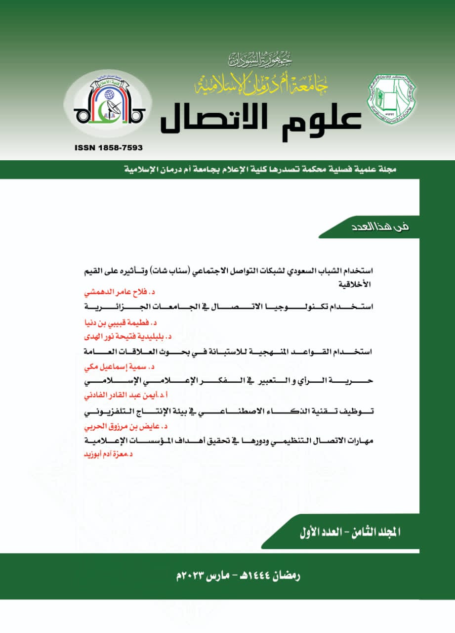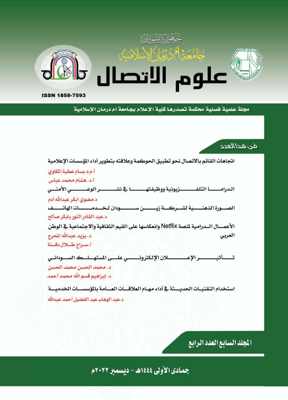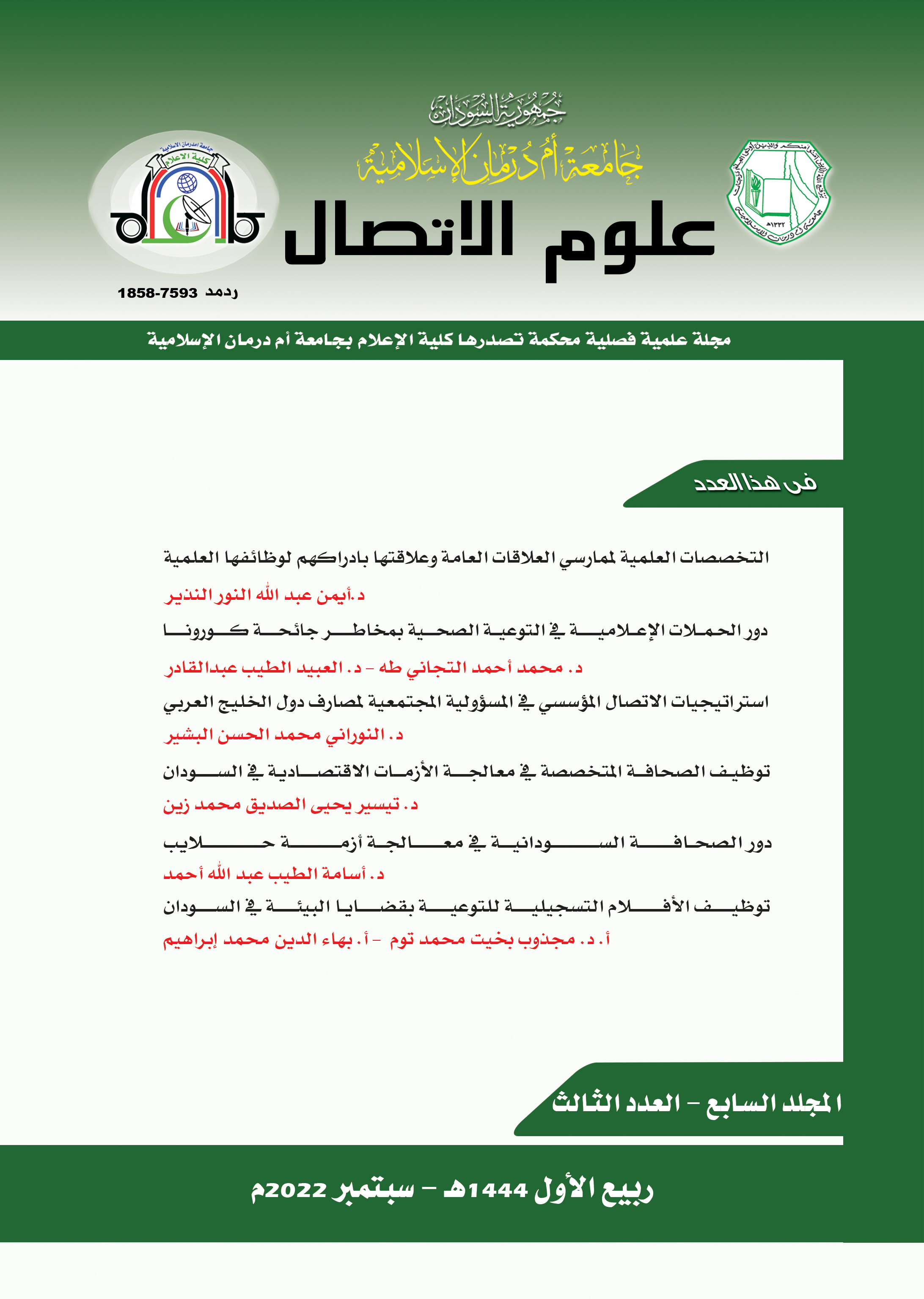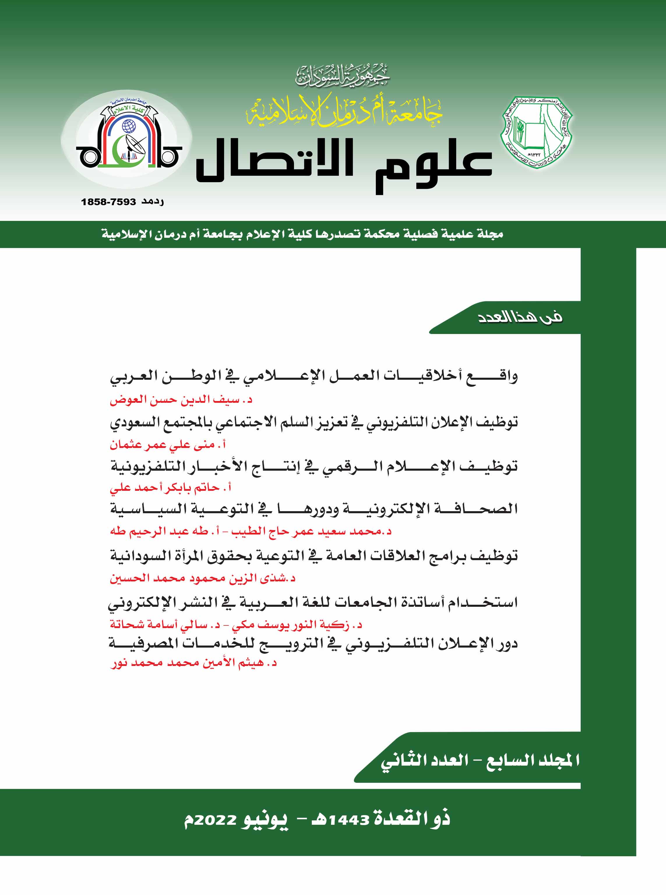 مجلد 7 عدد 2 (2022)الحمد لله رب العالمين، والصلاة والسلام على رسول الله الأمين صلى الله عليه وسلم. بفضل الله ومنه وكرمه وتوفيقه، تتواصل إصدارات مجلة علوم الاتصال الصادرة عن كلية الإعلام بجامعة أم درمان الإسلامية، وبين أيديكم العدد الثاني من المجلد السابع الذي يصادف ذو القعدة 1443ه ويونيو 2022م. اشترك في إعداد موضوعات هذا العدد تسعة باحثين من مختلف الجامعات السودانية والإقليمية قدموا مواداً بحثية متنوعة في مجالات الاتصال المتعددة منها الإعلام الإذاعي والتلفزيوني والعلاقات العامة وأخلاقيات مهنة الإعلام والإعلام الرقمي والإعلان الإذاعي. وقد خضعت جميع هذه البحوث بالطبع لمسلمات هذا النوع من الإصدارات وتقدر إدارة المجلة وهيئة التحرير القيمة العملية للموضوعات المبحوثة، وتهنئ الباحثين الذين قبلت أبحاثهم، وتعتذر للذين لم تقبل أبحاثهم لأغراض التجويد والتطوير العلمي. شكرنا لهيئة المستشارين ومنسوبي الكلية من الأساتذة ورؤساء الأقسام العلمية لجهودهم المقدرة في تطوير المجلة وشكرنا لكل من ظل يدعمنا بالفكر والنصح أو الشورى.
