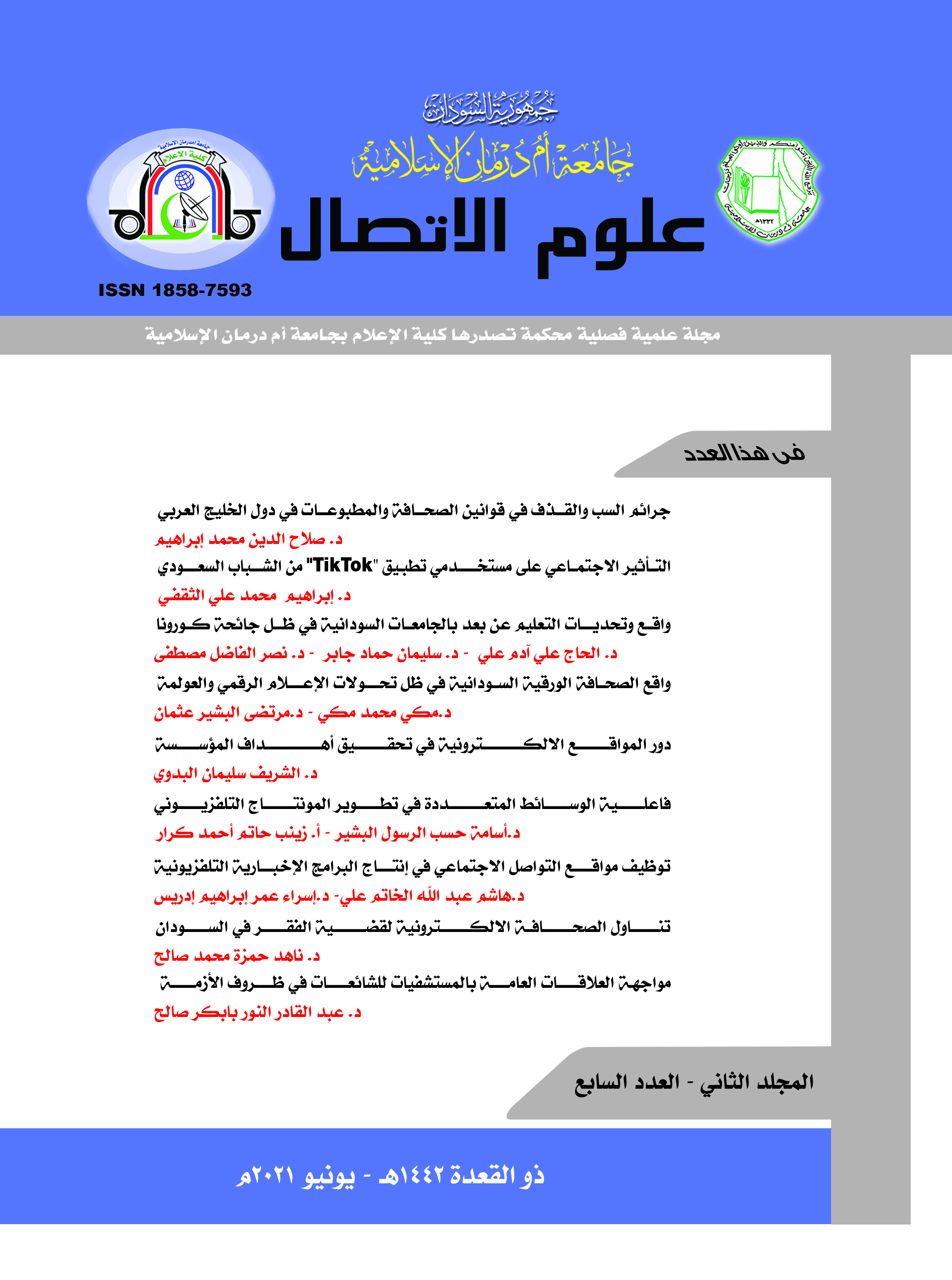 ملخص البحوث: يحتوي هذا العدد على موضوع جرائم السب والقذف في قوانين الصحافة والمطبوعات في دول الخليج العربي بقلم الدكتور صلاح الدين محمد إبراهيم، وموضوع آخر بعنوان التأثير الاجتماعي على مستخدمي تطبيق "TikTok" من الشباب السعودي للدكتور إبراهيم محمد علي الثقفي، وتناول كلٍ من الدكتور الحاج علي آدم علي والدكتور سليمان حماد جابر والدكتور نصر الفاضل مصطفى دراسة بعنوان واقع وتحديات التعليم عن بعد بالجامعات السودانية في ظل جائحة كورونا، وجاءت دراسة الدكتور مكي محمد مكي والدكتور مرتضى البشير عثمان بعنوان واقع الصحافة الورقية السودانية في ظل تحولات الإعلام الرقمي والعولمة، ودراسة الدكتور الشريف سليمان البدوي فقد جاءت عن دور المواقع الالكترونية في تحقيق أهداف المؤسسة، والدكتور أسامة حسب الرسول البشير والأستاذة زينب حاتم أحمد كرار تناولا فاعلية الوسائط المتعددة في تطوير المونتاج التلفزيوني، أما الدكتور هاشم عبد الله الخاتم علي والدكتورة إسراء عمر إبراهيم إدريس فقد تناولا في دراستهما توظيف مواقع التواصل الاجتماعي في إنتاج البرامج الإخبارية التلفزيونية، وتناولت الدكتورة ناهد حمزة محمد صالح موضوع الصحافة الالكترونية لقضية الفقر في السودان، وأخيراً كتب الدكتور عبد القادر النور بابكر صالح دراسته بعنوان مواجهة العلاقات العامة بالمستشفيات للشائعات في ظروف الأزمة.